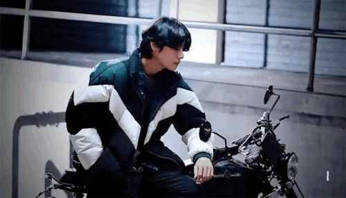Taehyung: (Clearing his throat, turning away) "Yeah." (He swung a leg over the bike, waiting.) "Come sit."